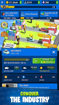 Kiekviena gamykla „Idle Inventor" atveria naują galimybių pasaulį ir kviečia išbandyti skirtingas transporto priemonių kategorijas. Valdykite penkias unikalias gamyklas ir surinkite daugiau nei šešiasdešimt skirtingų modelių: nuo elegantiškų automobilių ir oro skraidymo aparatų iki galingų statybinių mašinų, karinės technikos ir netgi kosminių tyrinėjimų laivų. Sujunkite išteklius ir technologijas, kad sukurtumėte visiškai naujus išradimus, praplėsdami savo pramonės nuotykių ribas. Samdykite daugiau nei 200 išskirtinių vadovų, kurie optimizuos jūsų gamybos linijas ir užtikrins sklandų veikimą be jokio mikrovadybos poreikio.