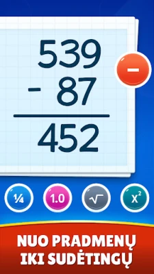 Ši mokymosi aplinka yra itin draugiška ir apsaugota nuo bet kokių išorinių trukdžių, sukuriant ramią erdvę susikaupimui. Jei atsiranda sunkumų, "Matematikos žaidimas" siūlo patogią "Mokytis" parinktį, kuri žingsnis po žingsnio paaiškins uždavinio sprendimą. Su begaliniu mokymosi potencialu, programėlė apima sudėtį, atimtį, daugybą, dalybą, trupmenas, dešimtainius skaičius, kvadratines šaknis, laipsnius ir mišrius veiksmus. Išbandykite savo žinias mišrių operacijų režime, treniruodami visus įgūdžius vienu metu ir paversdami smegenų lavinimą linksmybe bet kokio amžiaus žaidėjams, nuo darželinukų iki suaugusiųjų.