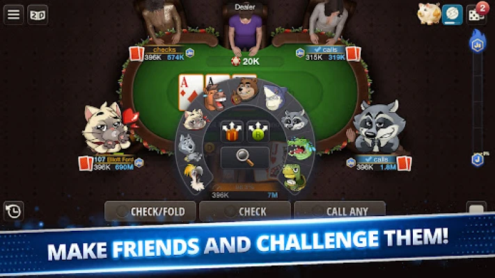 Žaidimas ne tik apie strategiją, bet ir apie bendruomenę. Kurkite naujas draugystes, meskite iššūkius ir bendraukite realiuoju laiku, siųsdami animuotus lipdukus ir reakcijas. Pelnykite titulus ir apdovanojimus gausybėje reguliarių turnyrų, įskaitant „Savaitės", „Džokerio", „Karališkojo Hold 'Em", „Miestų serijos" ir „Super savaitės" renginius. Registruokitės į specialius įvykius, tokius kaip „Elito klubas", mėnesiniai „Mega Shootouts", daugiapakopiai turnyrai ir itin populiari kasmetinė „Kalėdų pokerio serija". Atsipalaiduokite nuo pokerio stalo mūsų mini žaidimuose: išbandykite laimę lošimų automatuose arba braižomų bilietų loterijoje. Prisijunkite prie lojalumo programos ir „Karščio lygos" sistemos, kad gautumėte dar didesnių apdovanojimų ir premijų. Taupykite žetonus kiaulės taupyklėje ir išsigryninkite juos, kai labiausiai prireiks, arba kurkite privačius stalus jaukiems susitikimams su draugais. Laimėkite žetonų ir monetų, pelnykite kitų žaidėjų pagarbą ir siųskite dovanas, palaikydami draugystės ryšius. Žaiskite klasikinį „Texas Hold 'Em" arba pasinerkite į „Omaha" variantą, ieškodami naujų iššūkių. Įrodykite milijonams kitų žaidėjų, kad esate tikras pokerio meistras!