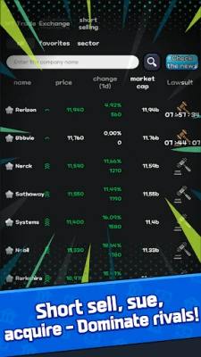 Pasiruoškite intensyviems akcijų mūšiams, kuriuose Jūsų finansinė drąsa bus išbandyta. Dalyvaukite įtemptose trumpojo pardavimo operacijose, teisiniuose ginčuose ir priešiškuose įmonių perėmimuose. Čia, "Selfmade Billionaire" visatoje, Jums teks įveikti konkurentus ir įsitvirtinti kaip neginčijamam rinkos lyderiui, siekiant absoliučios dominacijos. Parodykite savo verslumo nagus ir sukurkite nepalaužiamą imperiją.